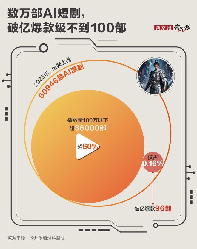尽管单部本钱极低、产出速率惊东谈主,“一东谈主年入几十万”的造富故事刷屏汇集,但行业爆款率低到离谱。上万部上线作品中,播放量破亿的爆款历历,超六成作品播放量惨淡,盈利费劲。