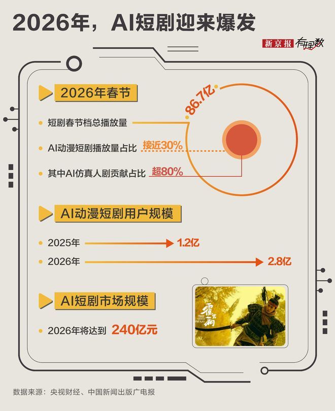 从春节档强势解围,到闲居榜单全面霸屏,AI短剧正以肉眼可见的速率席卷施行市集。行业机构推敲,2026年,AI动漫短剧用户限制将增长至2.8亿,市集限制有望达到240亿元。